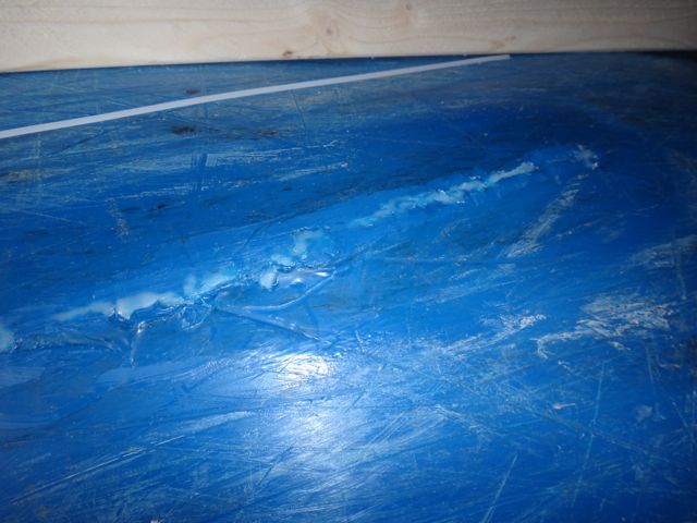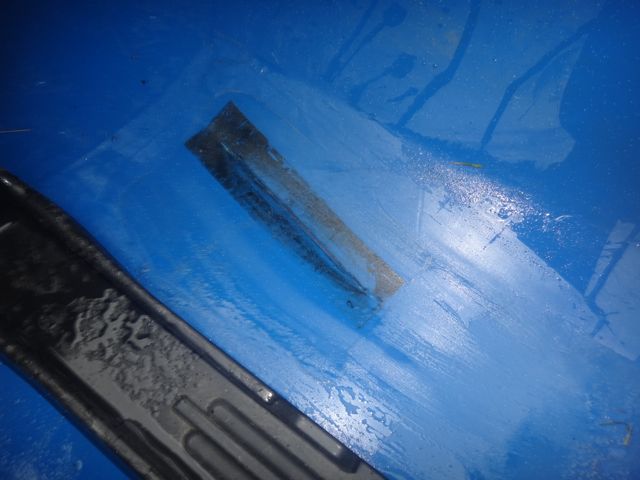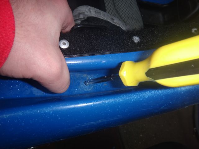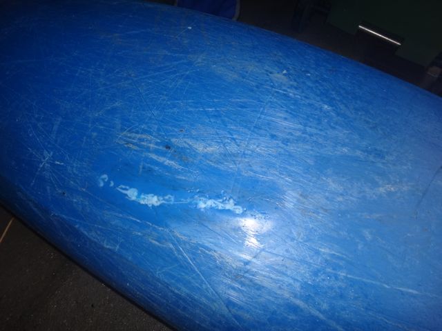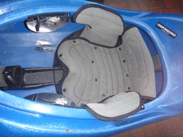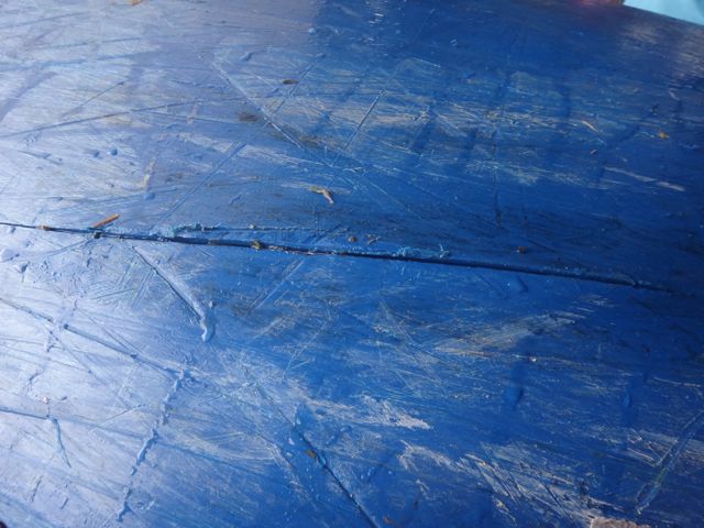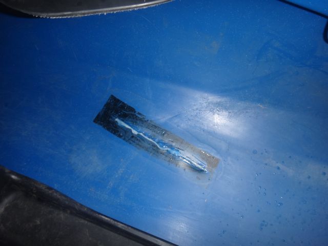 The split in the hull was fairly substantial being around 25cm long and stretched from just in front of and then under the seat. The first job was to remove the seat. This was really easy and took a couple of minutes. The parts were put safely to one side. The repair tape was removed and the split cleaned out and trimmed to expose fresh plastic.