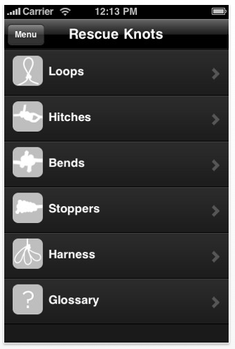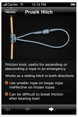 This is £0.69 App that shows a range of knots that could be used in range of situations including possible rescues. The interface is clean and easy to use. Each knot has a series of images that are very clear to follow/understand.